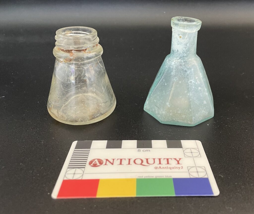 Figure 5: Profile view of two conical-shaped bottles from Grinnell College reference collection. (Edit: The bottle on the left is a glue/paste bottle based on the wide-mouthed opening (see comment by Evan Albaugh)