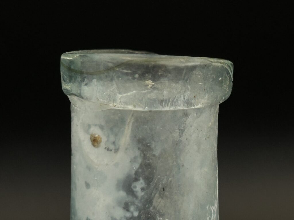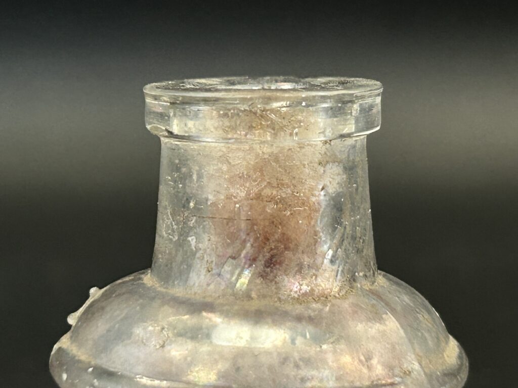 The lip of the bottle is squared off and slightly wider than the upper neck, known as a patent, extract, or flat-style finish. A comparison of the lip on our ink bottle can be made to another ink bottle in the Grinnell College reference collection, as shown in Figure 3 and Figure 4. This type of finish was most common from the mid-1800s to the end of the 19th century on extract/patent & proprietary medicine bottles. This style is used on hand-blown bottles and some of the earliest machine-produced ones. Although the patent-style finish is found on this particular ink bottle, it does not commonly appear on most.
