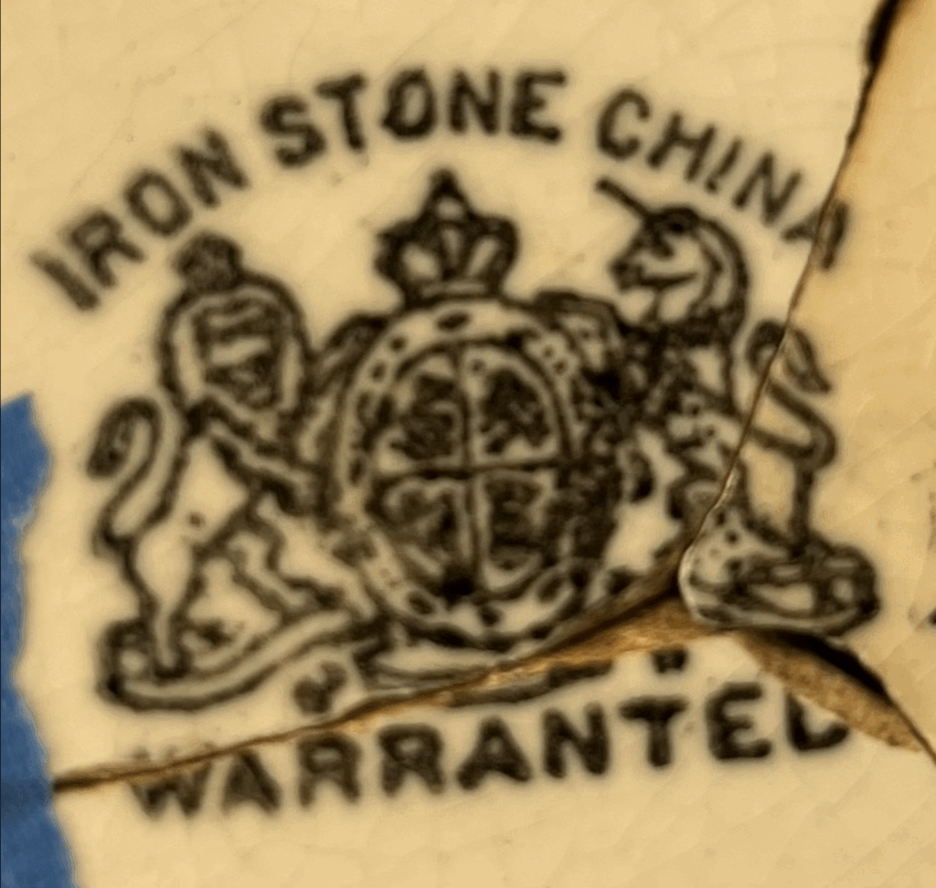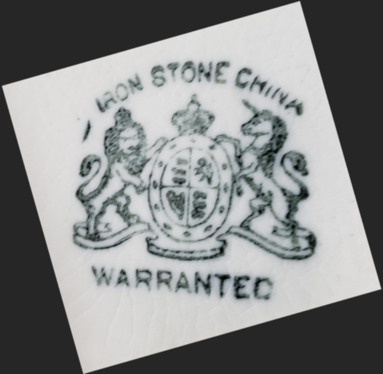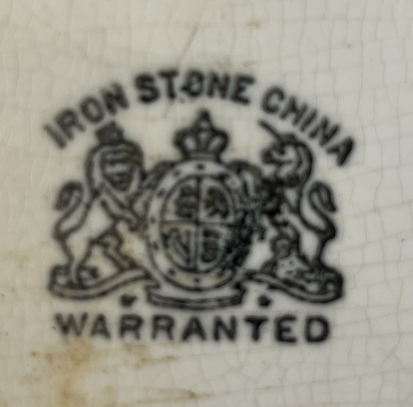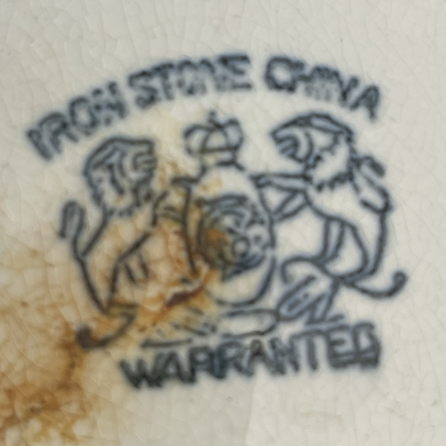 Two of the plates had identical maker’s marks and both were made by the George S. Harker Company in East Liverpool, Ohio between 1884 and 1890 (Harker n.d.). The coat of arms used in this maker’s mark is simpler than the one used by Alfred Meakin Ltd. Additionally, since the George S. Harker Company was American, they would not have had an official Royal Warrant to use the royal coat of arms. Since ironstone china originated in the UK and was produced by official royal pottery companies early on, American companies may have used variations of the Royal coat of arms to make their Ironstone China more attractive to buyers (Barker 2002).