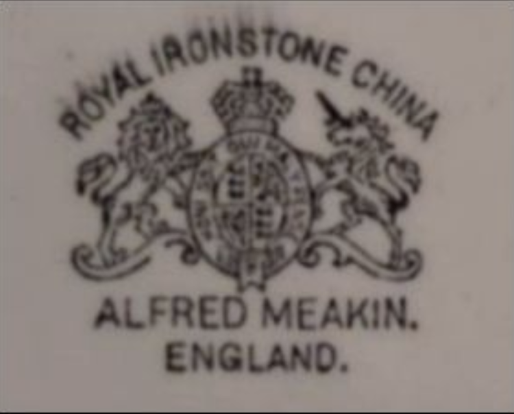 Alfred Meakin Ltd was a royal potteries manufacturing company founded in 1875 by Alfred Meakin (Alfred Meakin: Science Museum Group Collection). Alfred Meakin himself was born in Stoke-on-Trent, England where ironstone china originated (Alfred Meakin: Science Museum Group Collection, Barker 2002). This plate was most likely a genuine ironstone and Alfred Meakin Ltd had an official Royal warrant to use the royal coat of arms (Barker 2002, Birks n.d.).