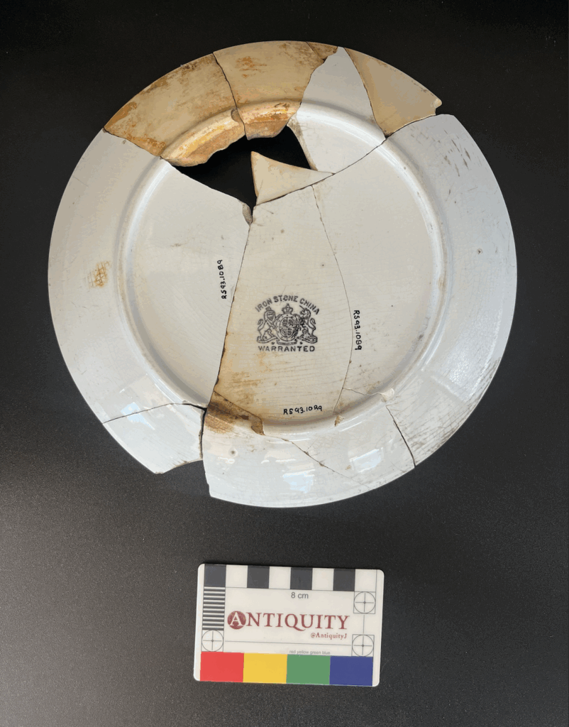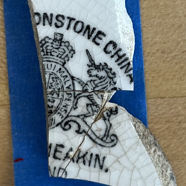 Ironstone china originated in England in the early 18th century and, despite its name, does not contain iron and is not china (what people tend to call Chinese export porcelains). It was introduced as a more affordable and durable alternative to Chinese porcelain. Ironstone china is generally considered to be a finer earthenware and is characterized by a recipe containing significant portions of china clay, china stone and calcined flint. However, the great popularity of ironstone china during the 19th century motivated many ceramics manufacturers to label many typical earthenwares as ironstones (Barker 2002). The “ironstone” plates found at Rock Springs Chinatown are thick enough to have been simple earthenware, though there is no exact distinction. Particularly, the plates from the Rock Springs Chinatown are white earthenware so they are referred to as whitewares.