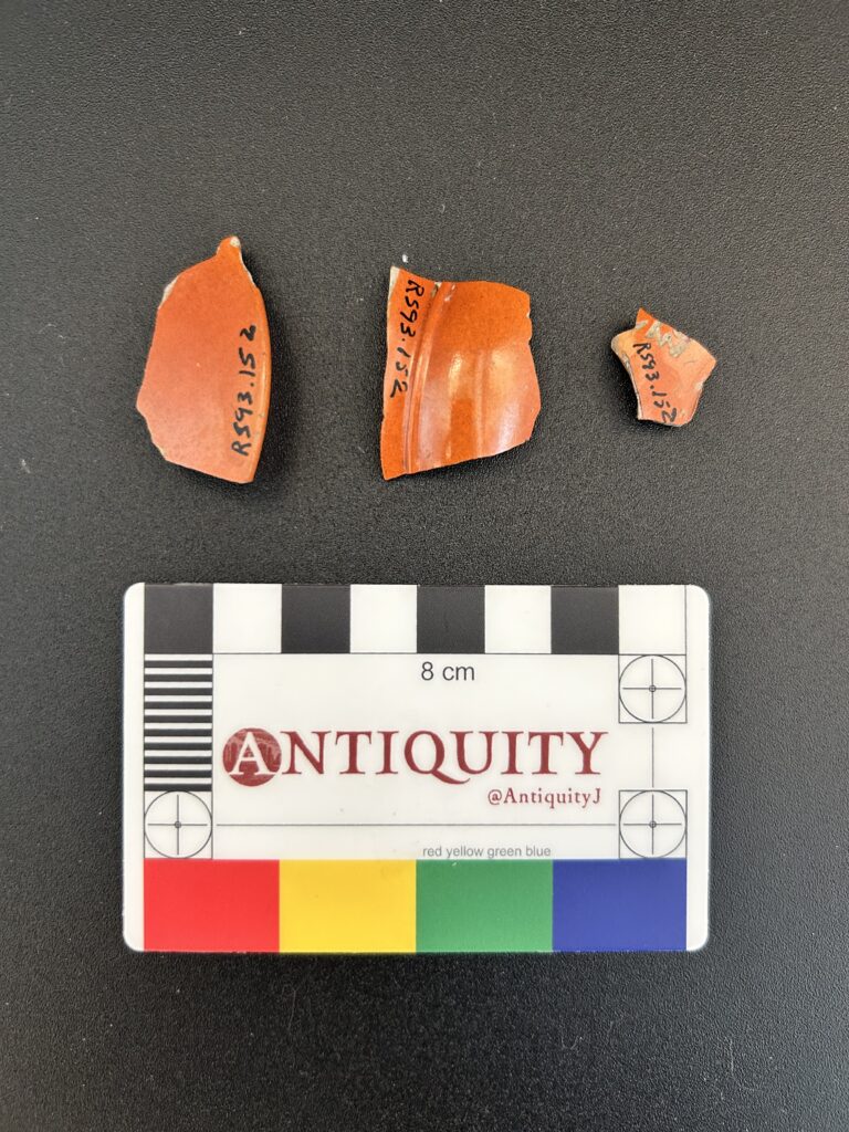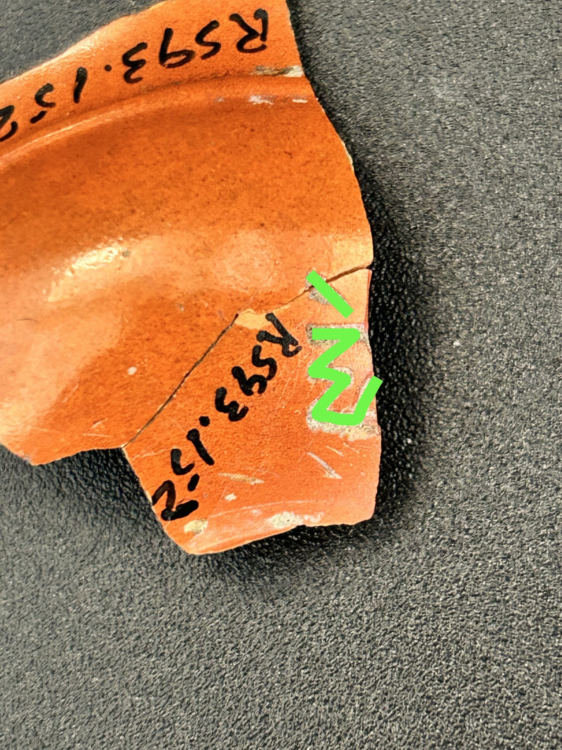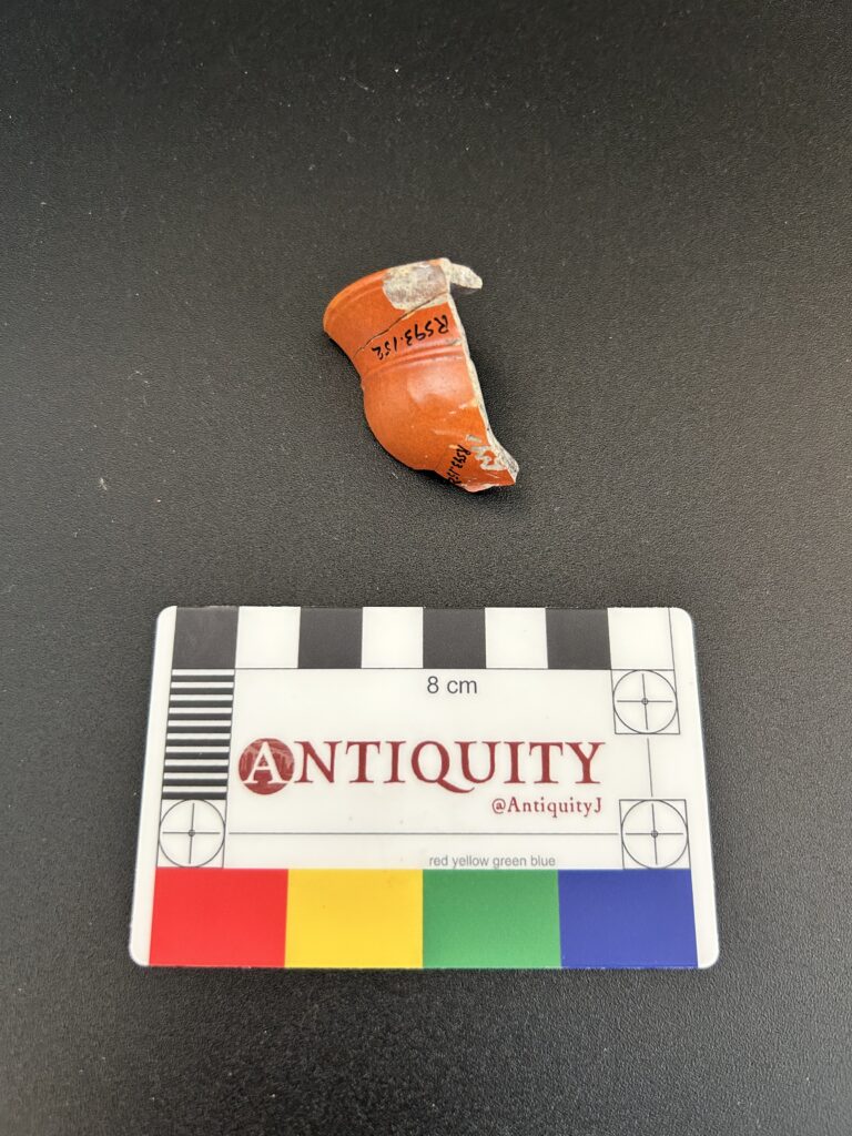 These three earthenware sherds made up a portion of a bowl’s top, rim, side, and shoulder (which would give me a lot to work with when trying to determine the technique that was used to create the bowl) and were coated with an orange glaze. I measured its rim to be 7.5 cm in diameter, with only 16% of the rim present on the rim sherd. Additionally, after closer examination, I noticed a Chinese character visible on the base of the bowl, which I will get into later in this blog post. Using Wylie & Higgins’ (1987) catalog of opium paraphernalia that they found at Riverside Chinatown, I concluded the following: