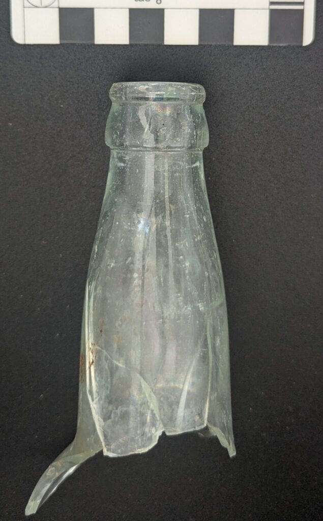 In Figure 3, the colorless bottle finish has an outer diameter of 2.5cm and is divided into two parts. The top of the bottle finish has a thin ring and below it is a thicker but slightly tapered component. The combination gives us enough clues to identify this as a crown finish. The ring on a crown finish is where a metal bottle cap would have been placed to seal the liquid contents of the bottle (SHA 2025). Bottles with a crown finish typically held carbonated beverages such as mineral water, soda, or beer (SHA 2025). Beer might be eliminated in this case as this bottle is colorless rather than brown. Mineral water in the late 19th to early 20th centuries were sold as health beverages that could cure chronic illnesses (Malley 2010).